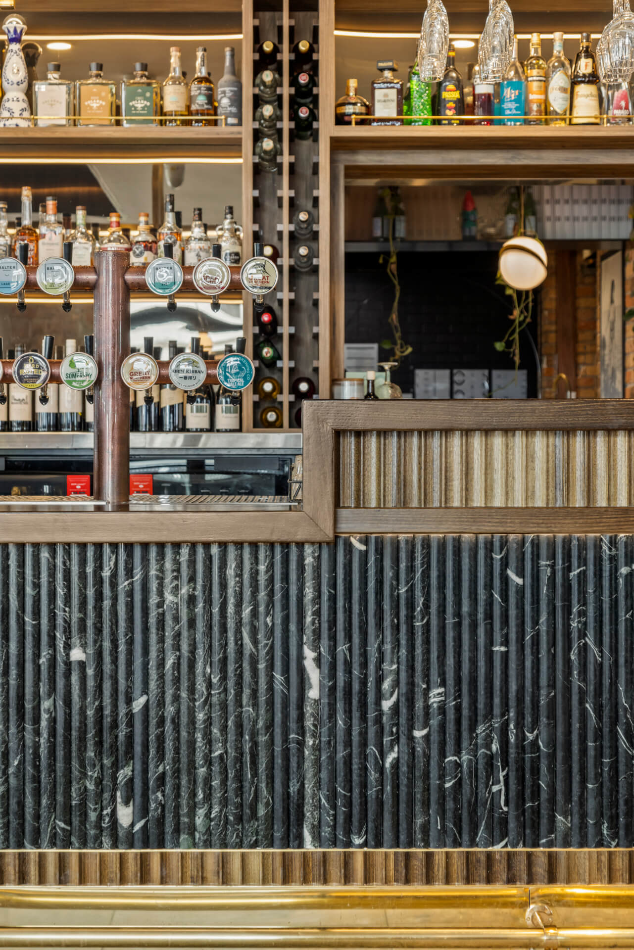 The fluted marble forms the bar’s signature identity, establishing rhythm, shadow and visual presence. Its tonal variation complements the building’s heritage palette.